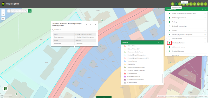 Można również skorzystać z Legendy by zapoznać się z kolorystyką obiektów na mapie dla struktury własności.